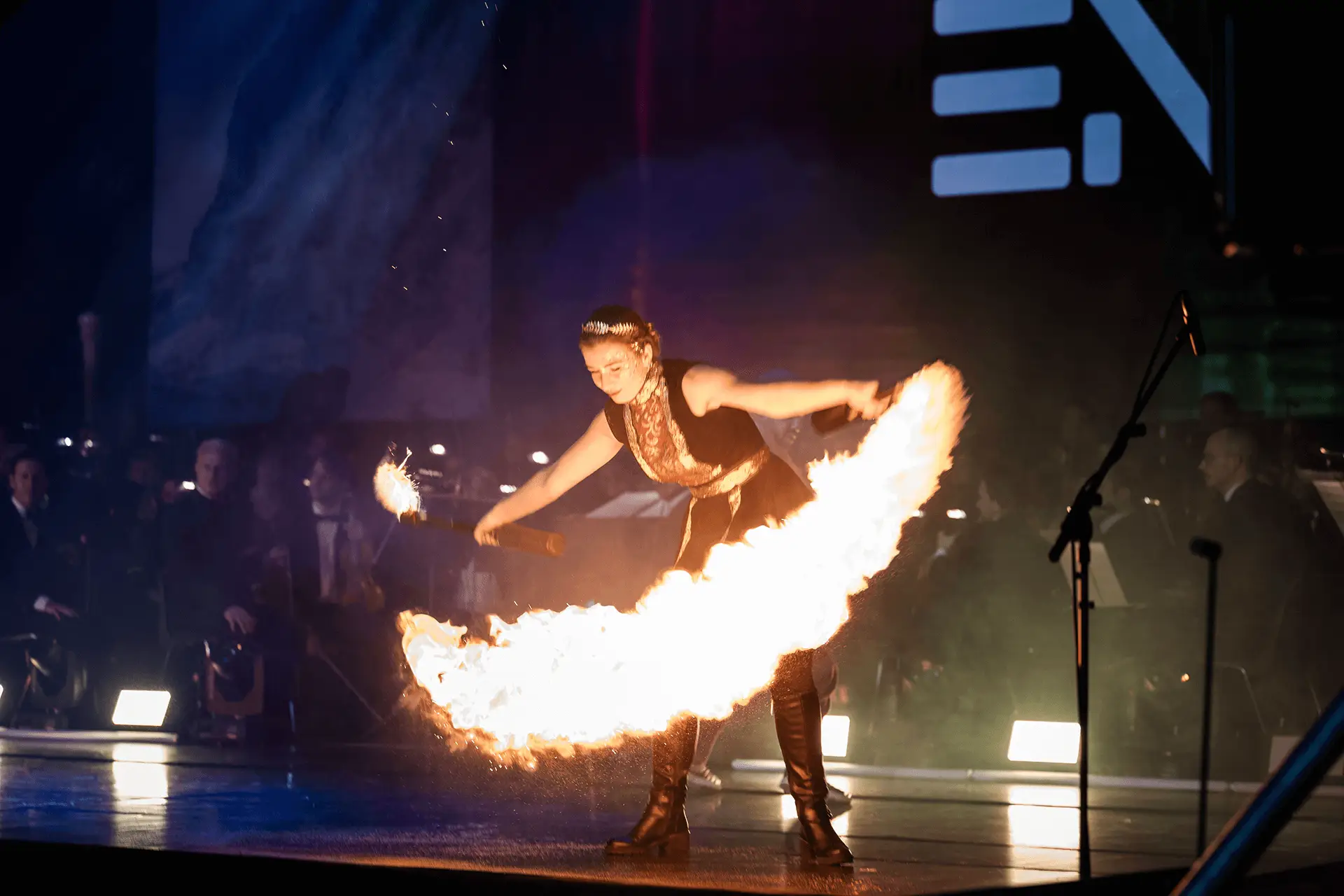 Feuer-Jonglage mit speziellen Requisiten – elegant choreografiert, perfekt für Gala-Settings
